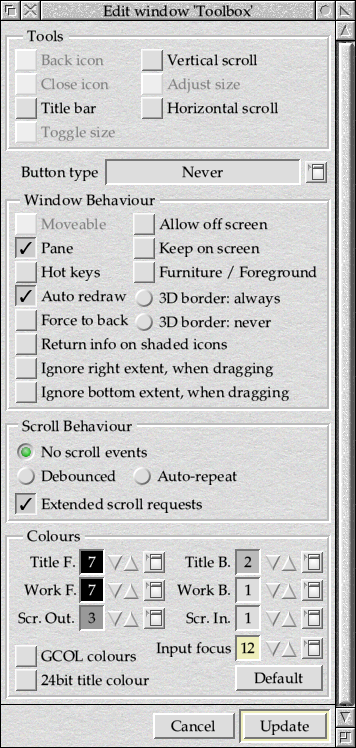 Our first action is to turn off all of the window furniture – including the title bar. The pane won’t be able to move independently of the window that it’s attached to, so there’s no need to give the user the option of trying! Under the heading of Window behaviour, the Moveable flag is also unset – this corresponds to the ‘window is moveable’ flag in bit 1 of the window flags, and indicates that the user can’t initiate window movement – the application still can, though.