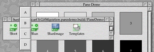 The code above deals with the position of the pane in the X and Y dimensions by adjusting its visible area, but what about the Z dimension – its position in the window stack? The Wimp requires that panes appear directly above their parent window; however, this is still left up to the application to manage.