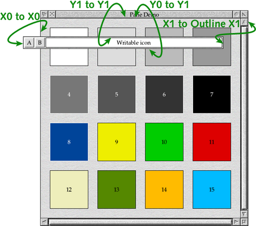 In practice, it does not matter too much in this specific instance: we’re still using visible area for aligning the X0 coordinates, so the horizontal work area coodinates for the two windows will be aligned and all that will happen is that we will include one pixel too many at the top end of the horizontal axis. The Wimp will clip this out for us, since child windows can’t extend outside of their parents, and there will be no visible effects. However it can have an effect in some situations, as we’ll see later on.