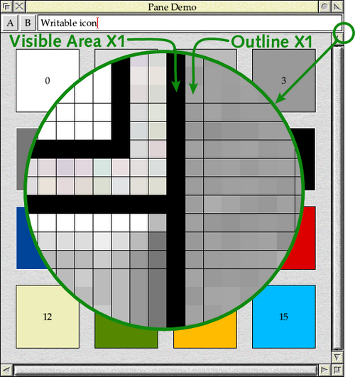 There is one small issue, however. The position of the pane is being set in visible area coordinates, but for X1 we’re now using the window outline in order to include the area covered by the vertical scroll bar. The outline coordinates, by definition, include the border around the edge of the window, whilst the visible area coordinates do not – although since the X1 coordinate is exclusive, both are offset by one pixel to the right as seen in Figure 8.4.