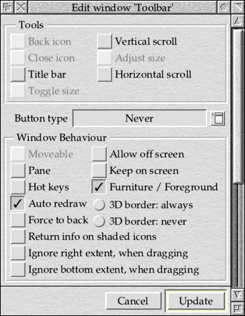 To make the design work, we will also need to designate the toolbar as being a Furniture Window, so that the Nested Wimp knows to integrate it with the main window’s furniture. This is done by setting the ‘furniture’ flag at bit 23 of the window flags; in WinEd, this is done by ticking Furniture / Foreground in the Window Behaviour section of the Edit window dialogue as seen in Figure 8.2.