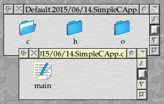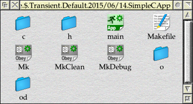 Compiling the project is simply a case of double-clicking on the Mk TaskObey file in the source folder. This should open a Task Window and, if all goes to plan, an absolute file called main should appear in the folder when the process is complete – along with the new o and od directories as shown in Figure 5.9. Double-clicking on main should cause our application to run, with exactly the same results as before.