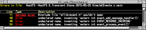 However, repeating the process from Section 3.4 with the new source code will result in failure as shown in Figure 5.2. Firstly, the included file sflib/event.h can’t be found; second, and as a direct consequence, several of the newly-introduced items in the example are being reported as “undeclared”.