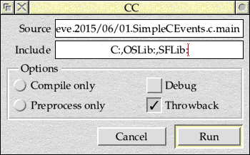 Once again, load CC on to the iconbar and drag main from the c folder of our project (in Download 5.1) to its icon to open the CC window with the Source field filled in.