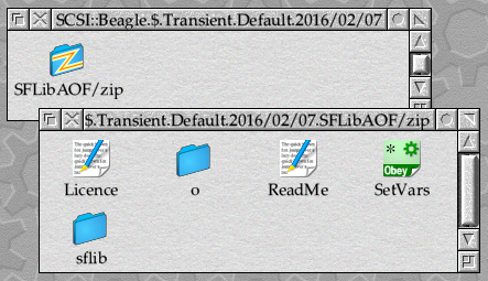 The solution to this problem is to install the SFLib library, in a similar way as to what we did for OSLib. Copies of the library can be downloaded in a form suitable for use with the DDE from my website – you need the AOF version. The library is licensed with the EUPL, meaning that it’s OK to use it in a range of open-source projects.