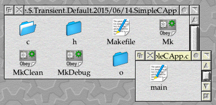 First, let’s clear up some terminology. Whilst the tool that processes makefiles is usually known as Make (including the one that ships with the RISC OS port of GCC), Acorn had to be different. Confusingly the DDE does contain a Make application, but it’s concerned with automatically creating makefiles – and these days its use is deprecated. Instead, Acorn called their version of Make the Acorn Make Utility, or Amu for short. It’s supplied with the other applications that form the DDE, although it’s very rare to actually run it directly.