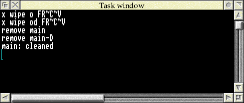 With all of this automatically generated output (both in Makefile, and as files and folders in the project folder), it would useful to be able to reset everything back to its starting point. Once again the Standard Makefiles can do that, and the MkClean TaskObey file is provided for the purpose. Double-clicking on it will produce a Task Window similar to that shown in Figure 5.13; at the same time, the main application should disappear, along with the o and od folders. Loading Makefile back into a text editor should reveal that the dependencies shown in Figure 5.11 have gone.