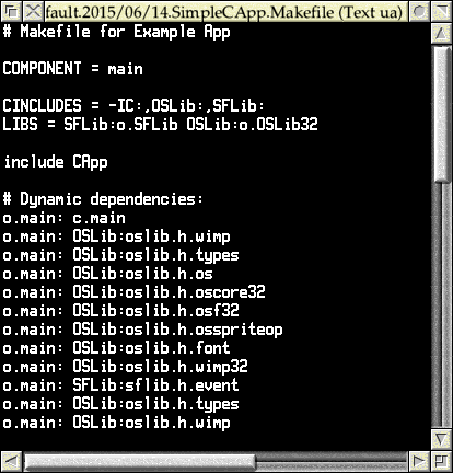 The include CApp line includes another makefile into this one: one called CApp that’s located in $.AcornC/C++.Makefiles. This is all handled transparently by the DDE, and is what makes Shared Makefiles work: the CApp makefile knows how to build a standard RISC OS application, so long as our file gives it the necessary information first. This means that it’s rarely necessary to write the ‘low level’ parts of a makefile when using Shared Makefiles.