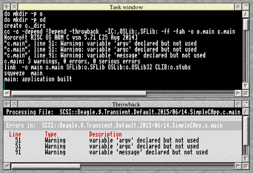 Unlike the output window used by CC in previous compilations, the Task Window that opened will contain all of the commands used to build the project. We can see commands to create the o and od folders, followed by a call to cc to compile c.main which throws up three warnings. As none of these were fatal, link is then called to link the resulting code with OSLib, SFLib and the standard C libraries before squeeze is used to squeeze the absolute file and reduce its size in a way that’s transparent to the user. The warnings are also reported in a throwback window, and the whole thing can be seen in Figure 5.10.