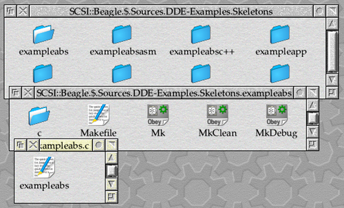Instead of using the Make application to assemble a makefile, current versions of the DDE recommend the use of Shared Makefiles. These have evolved from the tools used to build RISC OS itself, and provide an easy way to configure a project without much effort. To make things easier for beginners, a range of ‘skeleton projects’ are provided in $.Sources.DDE-Examples.Skeletons. Since we’re currently creating a simple Absolute file from our project, the one we need is exampleabs as shown in Figure 5.7.