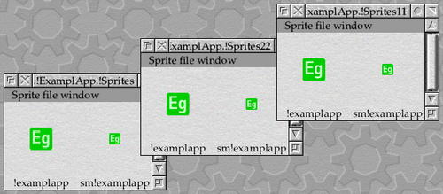 The first thing to do is to create a suitable set of sprite files. One possibility is shown in Figure 17.3, but others can easily be created using Paint or a package such as ArtWorks. An application should supply at least one ‘full size’ sprite with the same name as the application directory (in our case ‘!examplapp’); it can optionally supply a second ‘half size’ sprite, with the same name prefixed by ‘sm’ (in our case ‘sm!examplapp’).