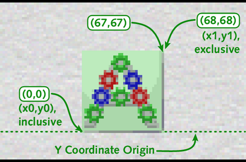 Icons are components of windows, however: when a window (such as a dialogue box) is moved around the screen, the icons move with it. This means that their locations are specified in relative terms with reference to the window itself. The units are still OS units, but they are no longer counting from the bottom left corner of the screen. A window’s origin can be moved around, but by default it is at its top left – as we’ll see when we look properly at windows, this means that the y coordinates of icons are often negative. The position of an icon is given in terms of two coordinate pairs: the minimum x,y (or bottom left, usually written “x0,y0”), and the maximum x,y (or top-right, usually written “x1,y1”). While x0 and y0 are inclusive, in that they point to the bottom-left pixel in the icon, x1 and y1 are exclusive: they indicate the pixel diagonally above and to the right of the top-right pixel of the icon.
