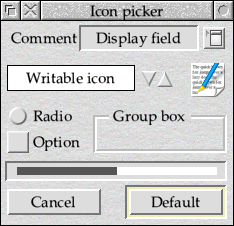 The Wimp sprite pool is a sprite area which is shared between all applications: any application can add images to it, and make use of those that are stored there. Its communal nature means that it’s bad practice to add images which are only required by one application: once added, sprites can’t be removed without a reboot, and without care, conflicts are all too easy. RISC OS pre-loads the area with a range of useful icons, including the familiar parts of dialogue boxes seen in Figure 6.1. A small selection of the icons added by the Wimp can be seen in Figure 6.3.