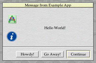 void repbox_message(char *message, char *buttons) { os_error error; error.errnum = 255; strncpy(error.errmess, message, os_ERROR_LIMIT); error.errmess[os_ERROR_LIMIT - 1] = '\0'; wimp_report_error_by_category(&error, wimp_ERROR_BOX_GIVEN_CATEGORY | (wimp_ERROR_BOX_CATEGORY_INFO << wimp_ERROR_BOX_CATEGORY_SHIFT) | wimp_ERROR_BOX_OK_ICON, "Example App", "application", wimpspriteop_AREA, buttons); }