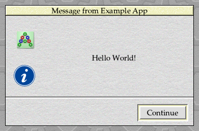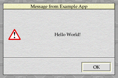void repbox_message(char *message) { os_error error; error.errnum = 255; strncpy(error.errmess, message, os_ERROR_LIMIT); error.errmess[os_ERROR_LIMIT - 1] = '\0'; wimp_report_error_by_category(&error, wimp_ERROR_BOX_GIVEN_CATEGORY | (wimp_ERROR_BOX_CATEGORY_INFO << wimp_ERROR_BOX_CATEGORY_SHIFT) | wimp_ERROR_BOX_OK_ICON, "Example App", "application", wimpspriteop_AREA, NULL); }