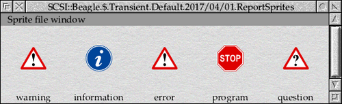 Each type of report has a different symbol displayed to the user at the left-hand side of the box: the ones used on RISC OS 5 can be seen in Figure 8.6 The symbols are in order, with category ‘warning’ (category 0) on the left through to ‘question’ (category 4) on the right.