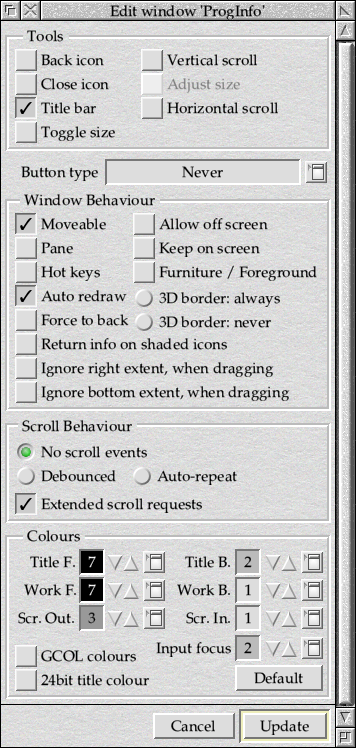 As we saw back in Section 12.3, we can turn off the bits of the window furniture that we don’t want on our dialogue. As part of a menu, the only tool that we want is the title bar, so untick all of the other switches in the Tools section. Also, as a dialogue box in a menu, the title bar should never change colour to indicate input focus (which we will meet in Chapter 27): we achieve this by changing the Input focus colour from 12 to 2 (which is the same as the default Title B. colour).
